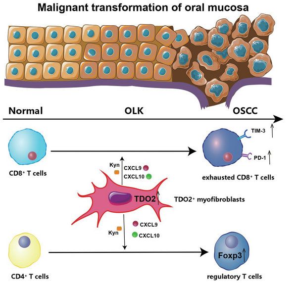 圖1 TDO2+肌成纖維細胞介導CD4+/CD8+ T細胞免疫抑制,促進口腔黏膜癌變進程示意圖