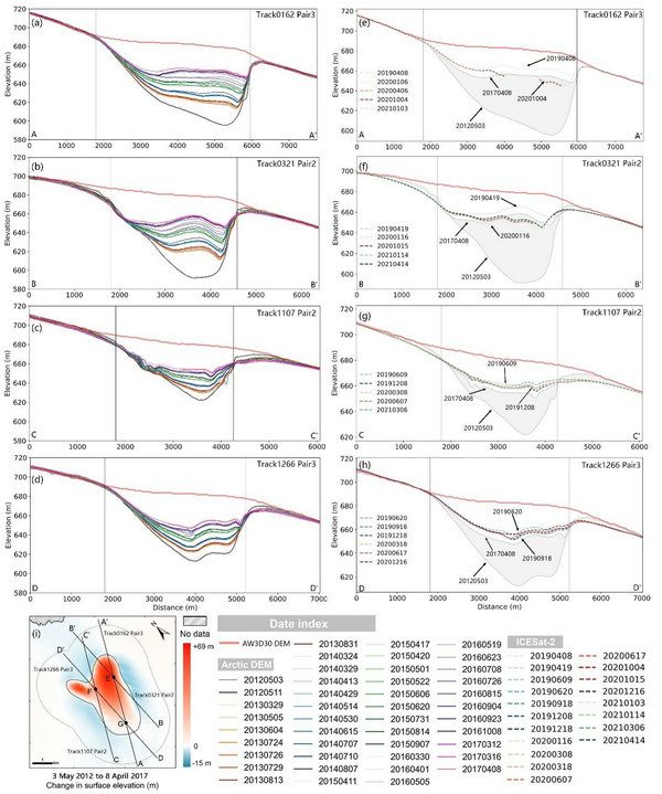 在2019年8月下旬發生了一次短暫的冰下湖排水事件,這次排水事件引起冰下湖下游區域冰流速突然增長到之前的3倍,但隨著冰下排水系統的完善以及融水的迅速排出,下游冰流速也迅速恢復至之前的狀態。研究表明,冰下湖現存水量的多少、底部基巖的地形起伏以及冰蓋表面融化狀態等多種因素共同決定著冰下湖的蓄排水周期。此外,本研究還對流入冰蓋底部的表面融水進行了量化,結果表明只有約64%的表面融水最終匯入了冰下湖中。