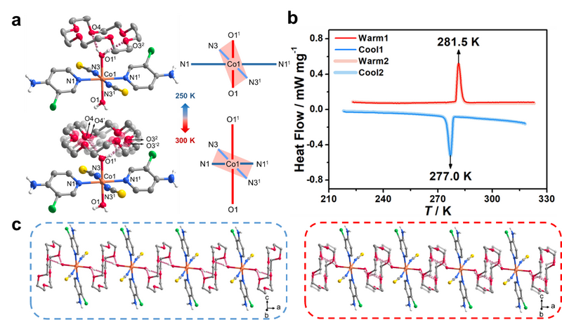 冠醚由于其結構靈活,可充當有序-無序型相變過程中分子馬達的“轉子”,被廣泛用于構筑人工分子機器及結構相變配合物。最近,分子磁體研究團隊通過選用18-冠醚-6和具有姜-泰勒效應的Co(II)離子,巧妙合成了一例具有“Rc···Rw?S?Rw···Rc”型超分子結構的磁性配合物(其中Rc和Rw分別指代冠醚和水分子“轉子”,S指代Co(II)“定子”)。上述磁性分子固體在室溫附近發生可逆一級相變,晶體結構上主要表現出姜-泰勒軸的可逆轉換以及18-冠醚-6“轉子”的熱輔助轉動(圖1),可推斷高溫時轉動的冠醚通過分子間氫鍵拉動配位水分子,從而觸發了分子結構的動態變化。