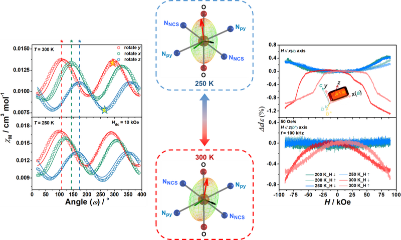 該工作精準設計與合成了一例有序-無序型Co(II)相變配合物,姜-泰勒軸和冠醚“轉子”的熱輔助動態變化引發了配合物磁電性質的可逆轉換,第一次為相變型分子磁性材料的單晶磁各向異性及磁介電效應的協同調控提供了范例。