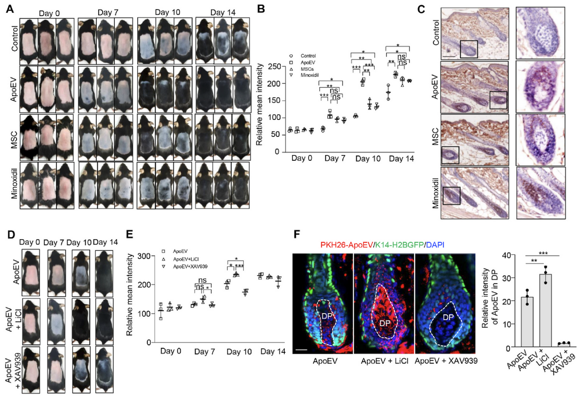 隨后,研究人員分離凋亡缺陷小鼠的皮膚和毛囊間充質干細胞 (Mesenchymal stem cells, MSC),發(fā)現apoEVs在排出過程中活化MSC中Wnt/β-catenin信號通路,改善MSC性能,并進一步證明apoEVs具有促進傷口愈合和毛發(fā)再生的功能。