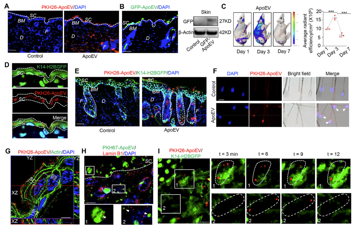 該研究通過尾靜脈途徑向小鼠體內注射熒光染料標記的apoEVs,利用免疫熒光、蛋白印跡、活體成像和超高分辨顯微鏡等手段觀測到apoEVs可從皮膚和毛發(fā)排出體外,并使用雙光子顯微鏡在活體小鼠上驗證此現象。