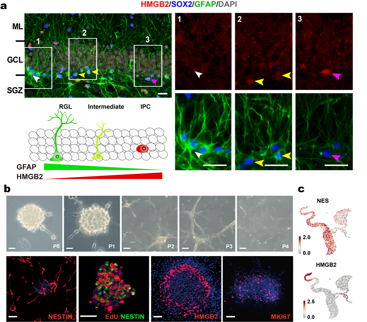 圖2 成年靈長類海馬體神經發生的關鍵調控基因及體外驗證。a.免疫熒光染色證明HMGB2 基因表達量與RGL 向IPC 的轉化過程密切相關; b.分離培養的成年食蟹猴海馬細胞具有多次分裂及傳代潛能,并表達典型的神經干細胞標志物;c.單細胞測序證明體外培養海馬細胞表達典型的神經干細胞標志物基因。