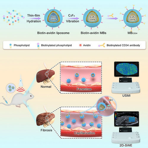 通過制備CD34靶向微泡,利用超聲分子影像技術(shù),對(duì)肝竇毛細(xì)血管化進(jìn)行可視化定量評(píng)估,同時(shí)進(jìn)行二維剪切波彈性成像,比較二者評(píng)估肝纖維化的準(zhǔn)確性、敏感性和炎癥影響