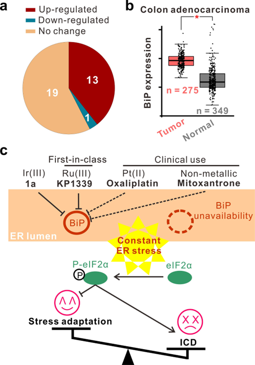 基于其它ICD相關研究的線索,團隊成員鎖定了ER stress的核心調控蛋白GRP78/BiP作為研究對象,通過一系列實驗驗證了1a可以通過降低BiP蛋白的穩定性進而抑制其活性。更有趣的是,已知的ICD藥物如米托蒽醌、奧沙利鉑等均可作用于BiP,預示了抑制該蛋白在激活ICD中的重要作用。最后經過生物信息學分析發現BiP在三分之一以上的腫瘤類型中高表達,具有抗腫瘤靶點潛力。綜上,本研究發展了一個新的ICD分子并基于化學蛋白質組學等技術發現了BiP蛋白在ICD中的作用。