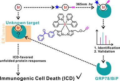 近日,中山大學藥學院鄒滔滔教授課題組與廣西師范大學梁宏教授課題組合作,根據ICD與內質網應激的較強聯系,發掘了出一個基于三價銥的抗癌金屬配合物(1a)具有良好的ICD活性。隨后,對該化合物的雙氮雜環卡賓配體進行修飾,引入了光親和標簽與疊氮基團,得到了可用于化學蛋白質組學研究的探針分子。課題組進而利用該探針抓取了一系列蛋白質靶標。