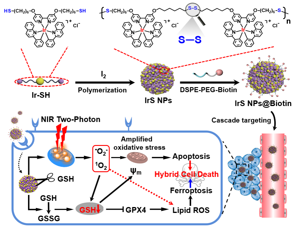 相關研究成果近期以“A Biodegradable Iridium(III) Coordination Polymer for Enhanced Two-Photon Photodynamic Therapy using an Apoptosis-Ferroptosis Hybrid Pathway”為題發表在化學綜合期刊Angew. Chem. Int. Ed.上。 論文第一作者為中山大學化學學院柯理兵博士和博士研究生韋方棉,論文通訊作者為中山大學化學學院巢暉教授。