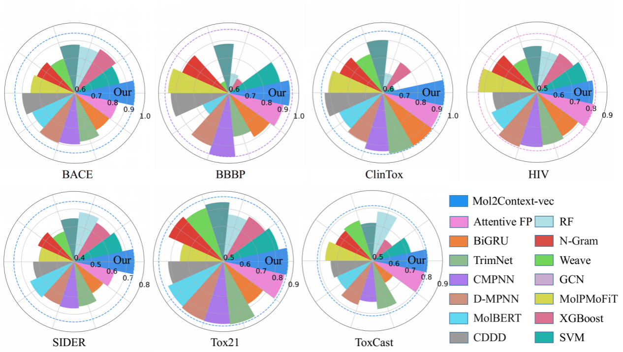 圖2. Mol2Context-vec和14種基線方法在生物活性和生理相關的基準數據集上的預測性能對比