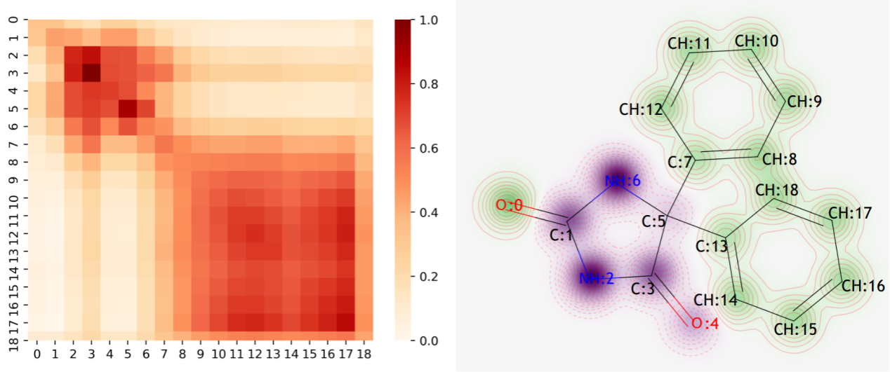 (a) 苯妥英原子相似度矩陣的熱圖 (b) 苯妥英分子結構中每個原子對溶解度的貢獻可視化