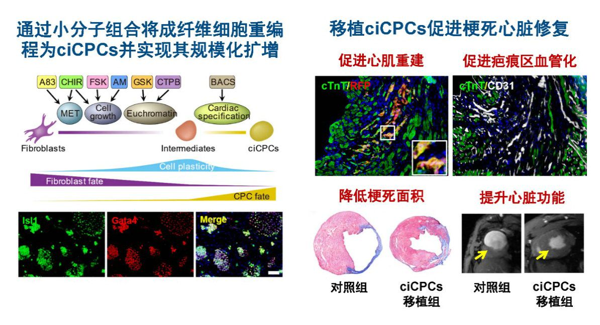 2022年3月31日,中山大學中山醫學院曹楠教授團隊在生物醫學工程領域著名期刊Nature Biomedical Engineering期刊(中科院1區TOP,IF="23.7)上發表了題為“Reprogramming" of fibroblasts into expandable cardiovascular progenitor cells via small molecules in xeno-free conditions”的論文。該研究首次使用小分子化合物組合將小鼠和人成纖維細胞重編程為CPCs(化學誘導的心血管祖細胞,chemically induced CPCs, ciCPCs)并實現其規模化擴增。將ciCPCs移植至梗死心臟后,其可同時促進瘢痕區心肌重建和血管化,進而顯著促進梗死心臟修復和心功能恢復。從而創建了從病人自體細胞制備和擴增CPCs,進而用于心臟修復的新策略。