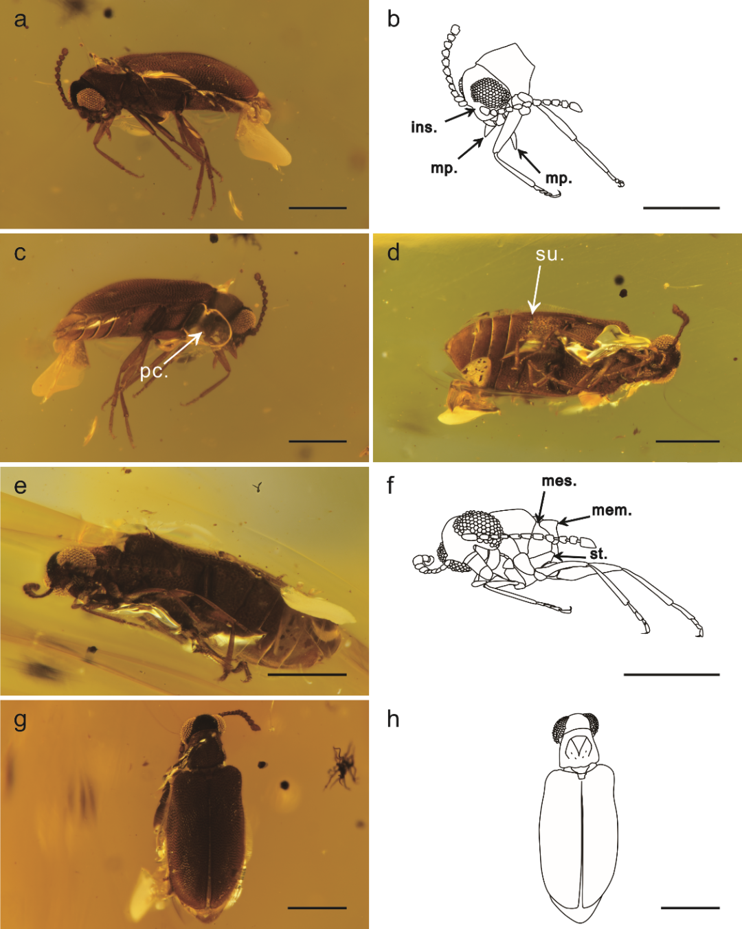 與現生親緣屬種相比,G. wukong在形態上并無太大差異,可以推測此類甲蟲的生活環境與習性自白堊紀以來相對穩定。值得注意的是,現生屬Euglenes與G. wukong系統學關系較為密切,主營腐食生活,對化石種的古生態研究具有重要參考意義。本研究發現進一步豐富了緬甸琥珀森林里腐生甲蟲的多樣性,體現出此時的生態系統已取得進一步發展。