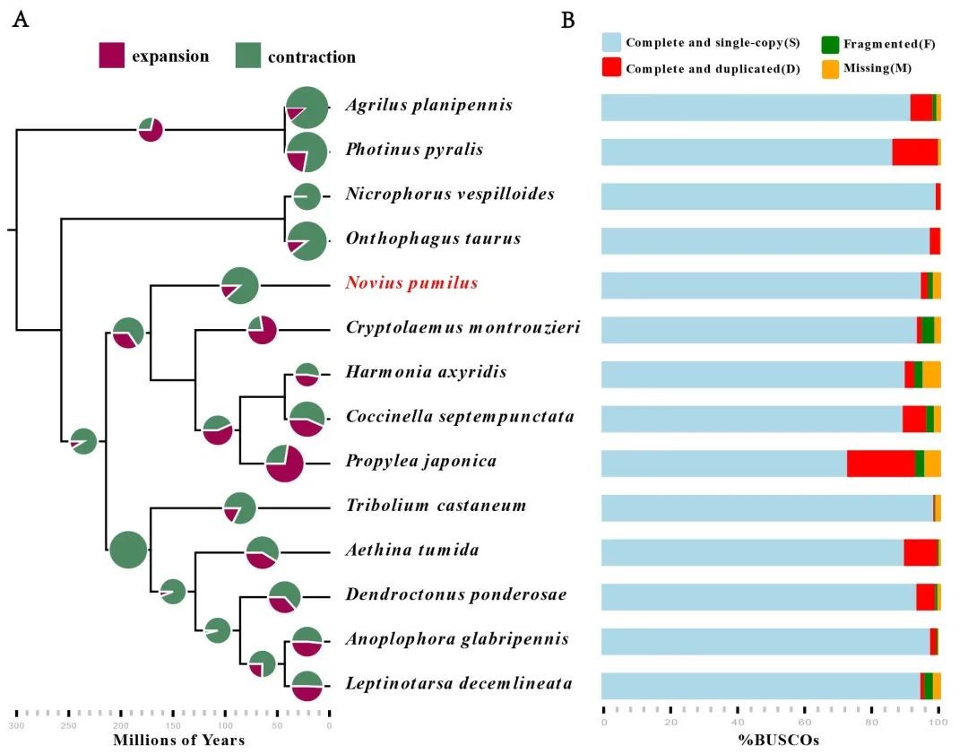 圖1 小短角瓢蟲與其他甲蟲基因家族的擴張收縮統計(左)與基因組完整度(右)