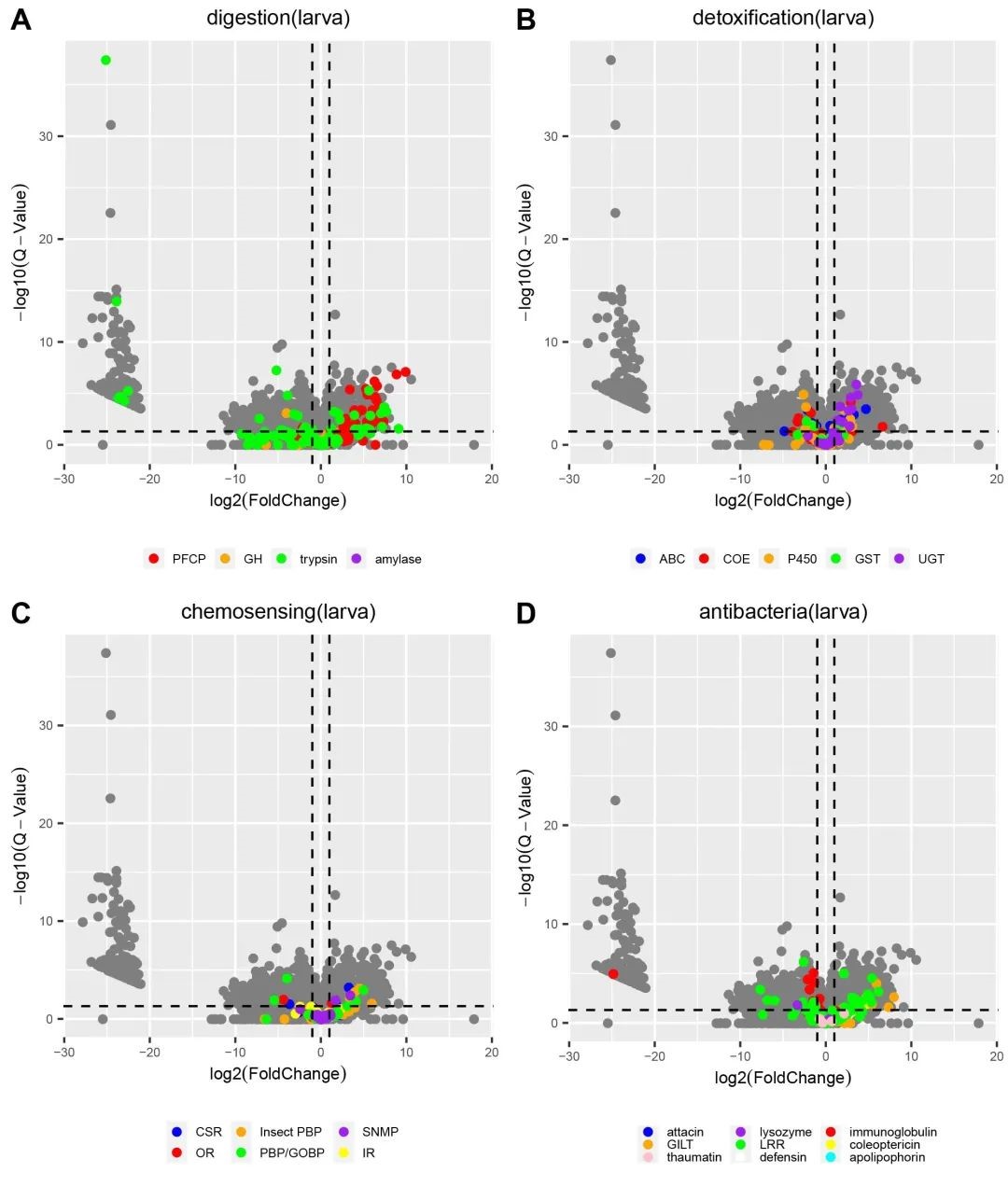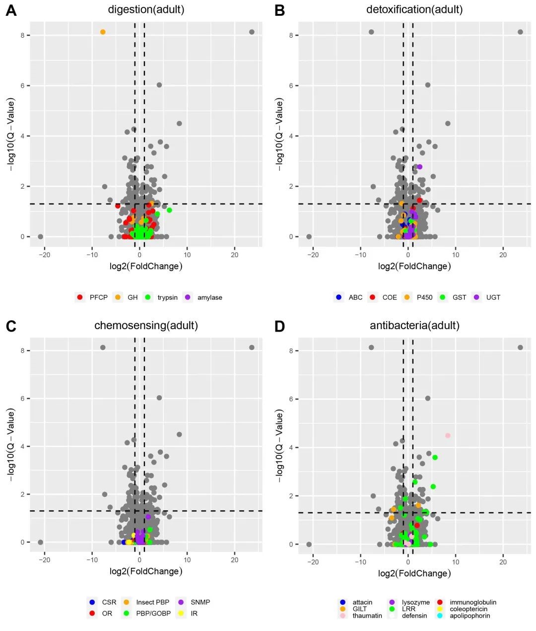 以往的研究表明,這些功能基因通常與捕食性甲蟲的取食和適應相關,如利用化學感受器尋找合適的食物、消化酶分解食物、而取食不同食物時免疫反應也不同,因此研究者們推測這些基因家族可能對小短角瓢蟲取食和適應吹綿蚧具有重要作用。