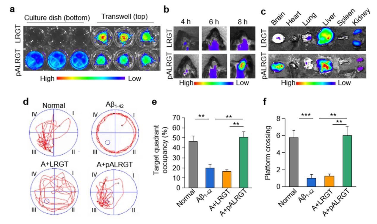 圖2:通過小鼠模型證實,pALRGT能有效穿透血腦屏障(a-c),改善小鼠認知功能(d-f)