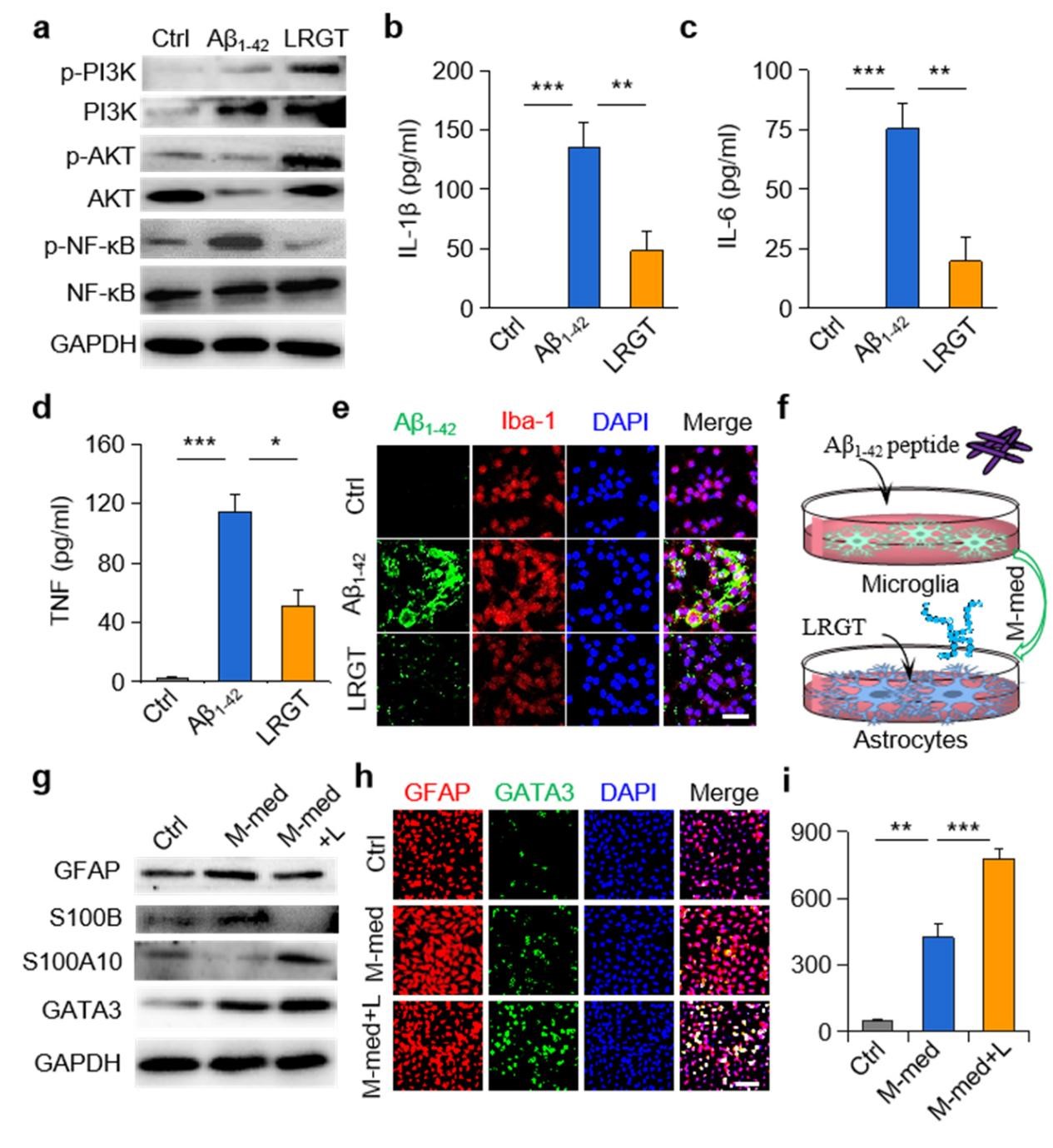 圖1:利拉魯肽降低小膠質細胞NF-κB的磷酸化水平(a),減少促炎因子濃度(b-d)并促進Aβ蛋白的清除(e);利拉魯肽抑制小膠質細胞對星形膠質細胞的激活(f-g),通過轉錄因子GATA3(h)促進IL-3的分泌(i)