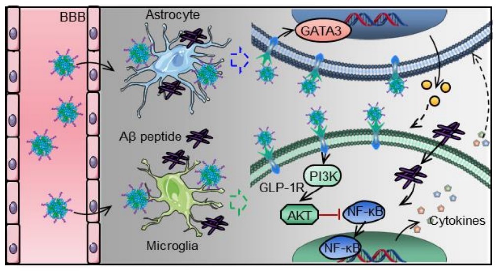 該課題系統性地研究了小膠質細胞-星形膠質細胞在免疫炎性環境中的相互作用,證實GLP-1受體激動劑可用于調節小膠質細胞和星形膠質細胞引起的免疫炎癥,pALRGT以其高BBB穿透性、高安全性、合成簡單快速等特點,未來有望有用于神經系統免疫及炎性疾病的臨床治療(圖3)。