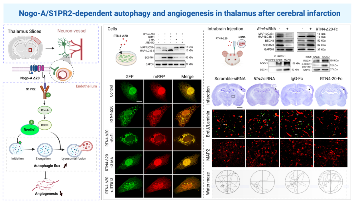相關研究成果再次發(fā)表在生物學一區(qū)期刊Autophagy,文章題目為“RTN4/Nogo-A-S1PR2 negatively regulates angiogenesis and secondary neural repair through enhancing vascular autophagy in the thalamus after cerebral cortical infarction”。中山大學附屬第一醫(yī)院神經(jīng)科邢世會教授和曾進勝教授為論文共同通訊作者,碩士研究生肖佩儀和古錦敏為共同第一作者。