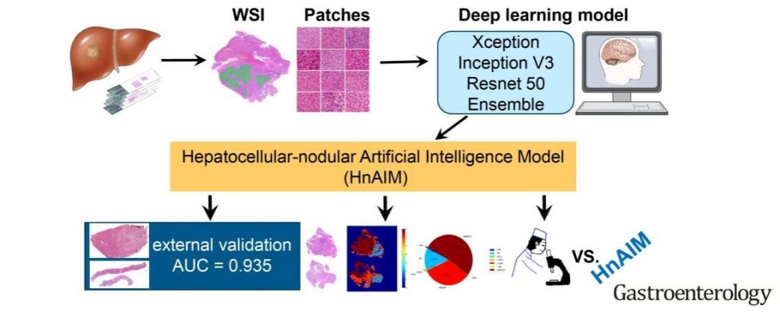 中大新聞網(wǎng)訊(通訊員葉張翔)近日,中山大學(xué)附屬第三醫(yī)院病理科邵春奎教授、陳健寧副主任醫(yī)師團隊聯(lián)合清華珠三角研究院韓藍(lán)青教授團隊,首次實現(xiàn)人工智能技術(shù)在肝結(jié)節(jié)病理診斷中的臨床應(yīng)用。該技術(shù)通過構(gòu)建HnAIM模型(Hepatocellular-nodular artificial intelligence model)智能診斷肝細(xì)胞結(jié)節(jié),達到了高年資病理醫(yī)師的診斷水平,可有效輔助病理診斷,成果發(fā)表在國際胃腸肝病學(xué)頂級雜志Gastroenterology (IF=22.682)。