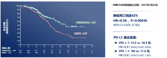 研究結(jié)果顯示,與安慰劑聯(lián)合化療組相比,特瑞普利單抗聯(lián)合化療顯著延長(zhǎng)了無(wú)進(jìn)展生存期,使疾病進(jìn)展或死亡風(fēng)險(xiǎn)降低了42%(HR 0.58,P<0 .0001),27.8%的患者在1年內(nèi)未發(fā)生疾病進(jìn)展或死亡(安慰劑組僅為6.1%)。更為重要的是,總生存期的期中分析即取得了陽(yáng)性結(jié)果:與安慰劑聯(lián)合化療組相比,特瑞普利單抗聯(lián)合化療可顯著延長(zhǎng)患者的總生存期(中位生存期 17.0個(gè)月 vs 11.0個(gè)月),刷新了晚期食管鱗癌一線治療的生存期紀(jì)錄;死亡風(fēng)險(xiǎn)顯著降低42%(hr 0.58, p="0.0004),1年生存率也明顯提高(66.0%" vs 43.7%)。