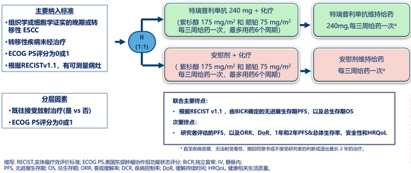 作為我國(guó)原研的PD-1抗體,特瑞普利單抗具有強(qiáng)效的PD-1親和力,可完全阻斷配體結(jié)合,獨(dú)特的內(nèi)吞效應(yīng)可降低PD-1在膜表面的表達(dá)。在前期的Ib/II研究中,特瑞普利單抗單藥或聯(lián)合紫杉醇和順鉑在晚期食管鱗癌患者中顯示了可觀的前期療效及良好的安全性。基于此,中山大學(xué)腫瘤防治中心徐瑞華教授、王峰主任醫(yī)師牽頭開(kāi)展了一項(xiàng)隨機(jī)、雙盲、安慰劑對(duì)照的Ⅲ期臨床研究(JUPITER-06),探討特瑞普利單抗聯(lián)合紫杉醇和順鉑用于晚期食管鱗癌一線治療的有效性和安全性。該研究共有72家單位參與,共入組514例受試者,按照1:1隨機(jī)分組,分別接受特瑞普利單抗聯(lián)合紫杉醇和順鉑或安慰劑聯(lián)合紫杉醇和順鉑治療。