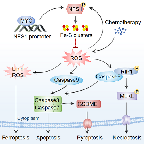 該研究發現了結直腸癌細胞對奧沙利鉑耐藥的新機制,鐵硫(Iron-sulfur, Fe-S)簇合成酶半胱氨酸脫硫酶(Cysteine desulfurase, NFS1)依賴其Ser293磷酸化水平抑制結直腸癌細胞發生多種細胞死亡(PANoptosis),進而降低腸癌對鉑類的敏感性,半胱氨酸脫硫酶缺失可增敏腸癌細胞對奧沙利鉑的敏感性。