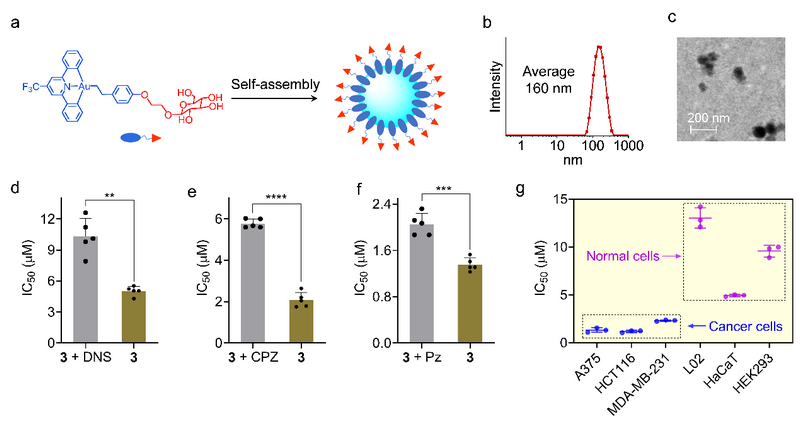 圖2. 葡萄糖官能化的金(III)配合物在水溶液中發生自組裝形成納米顆粒(a, b),發生葡萄糖轉運體GLUT介導的胞吞攝取(c),從而實現對癌細胞的選擇性(d)