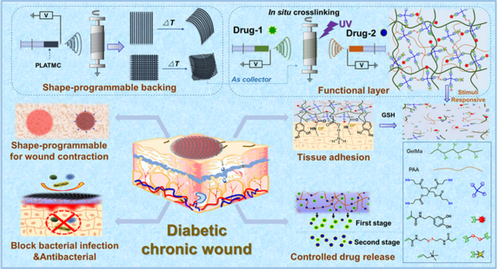 為解決上述科學問題,中山大學附屬口腔醫院夏娟和李衛昌團隊針對糖尿病創面的修復需求,開發了一種形狀可編程層級結構復合膜體系(圖釋),通過協同調節炎癥微環境有效促進糖尿病創面的修復與再生。具體而言,該復合膜體系主要由靜電紡絲構建的支撐層和功能層組成,其中支撐層可通過形狀記憶機制實現對組織創口的雙軸機械主動收縮,在促進修復過程中防止創面的擴張。功能層內部層級結構可有效控釋不同功能的藥物梯度釋放,滿足創面不同修復時期的特異性需求;其抗菌/抑菌纖維網絡結合抗菌類藥物對糖尿病創面典型的慢性炎癥有較好的抑制作用;此外,具有粘合功能的活性化學位點設置可將膜體系穩定黏附于組織表面,而高分子網絡中引入的響應官能團可通過刺激破壞纖維網絡結構,實現粘合界面的靈活分離。論文重點探究了高分子纖維網絡結構對材料體系宏觀性能的影響規律以及對糖尿病創面的修復機制,并通過理化性能測試、生物學檢測、動物實驗等手段,系統評價了其應用的靈活性、安全性和有效性。本研究為臨床糖尿病創面的治療提供了一種新的解決方案,有望加快實現功能型創面修復體系在生物醫學領域的應用突破和產業鏈延伸。