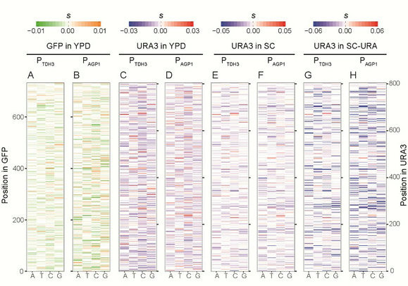 為了解決上述問題,陳小舒教授團隊與楊建榮教授團隊設計了一種新的實驗方法來大規模測定蛋白質編碼基因的所有單核苷酸突變的表型效應。團隊使用該方法測定了綠色熒光蛋白 GFP(一個外源基因)與 URA3(一個在特定條件下必需的內源基因)兩個基因內幾乎所有突變,在兩個活性相差10倍的啟動子控制下的表型效應。研究發現(i)基因內至少42%的突變會因表達量改變而呈現不同的表型效應;(ii)與低表達時相比,必需基因高表達時更能容忍突變對基因功能的削弱作用;(iii)由于各種隨機分子錯誤,基因表達升高會增強突變帶來的細胞毒性。因此,上述結果直接證實了基因突變的表型效應具有表達依賴性,為理解上位效應的分子機制,和對基因組數據的精準解讀提供了新的理論基礎。