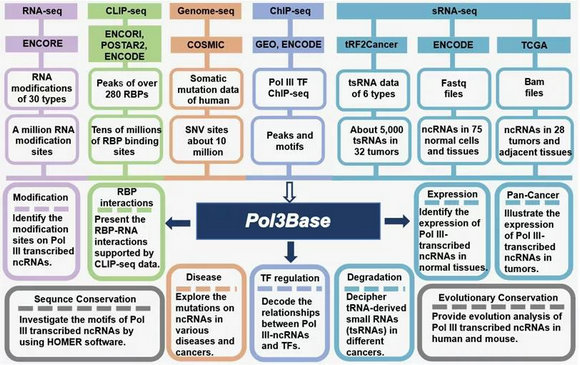RNA組學(xué)團(tuán)隊(duì)率先開(kāi)發(fā)一系列分析流程去發(fā)掘~79000個(gè)PolⅢ轉(zhuǎn)錄的非編碼RNA(P3RNA)與轉(zhuǎn)錄因子的互作組以及這些P3RNA與240多種RNA結(jié)合蛋白之間的相互作用網(wǎng)絡(luò);揭示了70個(gè)正常組織和28種不同腫瘤類型中P3RNA的表達(dá)譜及9700個(gè)表觀RNA修飾位點(diǎn)。此外,通過(guò)比較人類和小鼠,發(fā)現(xiàn)了大約4000個(gè)進(jìn)化保守的P3RNA;在32個(gè)不同的腫瘤組織中鑒定了上萬(wàn)種 tsRNA。通過(guò)分析體細(xì)胞突變數(shù)據(jù),Pol3Base還提供研究了這些ncRNA的突變圖譜,以幫助揭示它們?cè)诙喾N疾病中的潛在作用。Pol3Base 的訪問(wèn)網(wǎng)址:http://rna.sysu.edu.cn/pol3base/ 或者h(yuǎn)ttp:// biomed.nscc-gz.cn/DB/Pol3Base/。