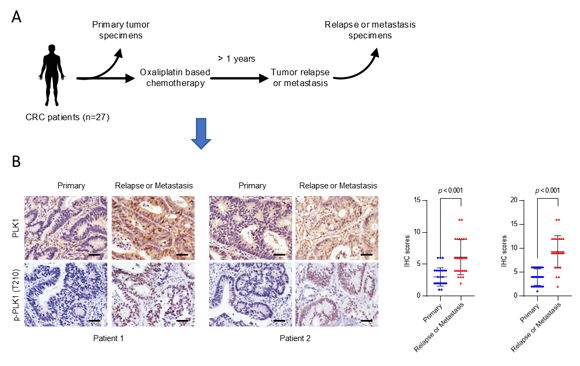研究團隊通過整合分析大規模結直腸癌患者樣本數據,發現PLK1可能是結直腸癌的潛在藥物靶點。并發現化療后復發的患者腫瘤組織中PLK1高表達,提示可能與化療耐藥相關(圖2)。