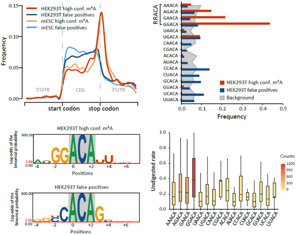 MeRIP-seq(或m6A-seq)是目前最常用的RNA修飾檢測方法,被大范圍的用在m6A相關研究中。該方法原理是用m6A特異性的抗體對片段化的RNA進行免疫沉淀反應,將含有m6A的片段富集出來進行測序。在研究同時對體外轉錄IVT RNA文庫也進行MeRIP-seq,結果表明即使是對不含m6A修飾的IVT RNA文庫,抗體依舊能夠富集到大量RNA片段,并且這些富集的“peak”在已發表結果數據中重復出現,表明MeRIP-seq其實受到假陽性信號的嚴重干擾。分析IVT RNA中被富集下來的區域,發現這些區域所在的基因表達量較高且富含腺嘌呤。去除假陽性信號后,鑒定出來的修飾區域更準確(圖3)。