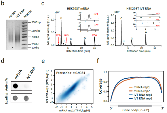 圖1 體外合成RNA文庫(IVT RNA)具有與內源轉錄組相似的表達量,但不含有修飾堿基。