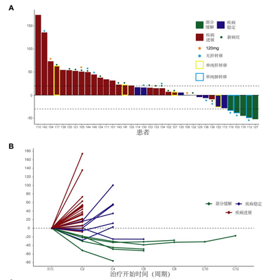 (A) 按照RECIST1.1標準評估的患者自基線的腫瘤體積變化