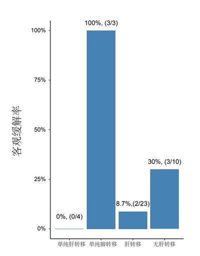 只有肝轉移、只有肺轉移、有肝轉移、無肝轉移患者的客觀反應率
