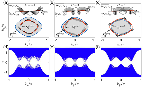 圖1:當系統(tǒng)的能帶反轉面按順序嵌套時(a,b),系統(tǒng)中存在類手征高階拓撲邊界態(tài)(d,e),其數(shù)量由不同能帶反轉面上贗自旋卷繞數(shù)確定。當能帶反轉面不按順序嵌套時(c),系統(tǒng)不存在高階拓撲邊界態(tài)(f)。