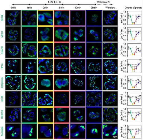 細胞內廣泛存在相分離(Phase Separation)現象,成千上萬的蛋白或核酸分子在復雜的細胞內部形成一個一個無膜“隔間”,就像油滴在水中一樣,彼此互不干擾地參與細胞內如轉錄調控、應激、蛋白質質量控制、DNA復制等多種重要的生物學過程。1,6-己二醇(1,6-HD)是一種能夠使得相分離液滴溶解的化學小分子,它是目前唯一的能同時破壞多種相的工具,所以非常有潛力應用于研究全局層面上相分離現象與其他生物學進程或結構之間的關系。但是,在不同的研究中,1,6-HD的應用條件千差萬別,沒有統一的標準,某些條件甚至會導致細胞凋亡、蛋白異常凝集、細胞皺縮、染色質“凍結”等副作用,這大大阻礙了這一工具的應用。