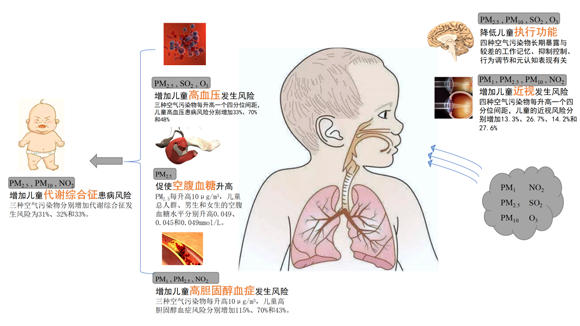 基于全國7省市(上海、廣東、天津、重慶、遼寧、寧夏、湖南)兒童青少年的大型流行病學調查,團隊聯合研究發現,長期暴露于PM2.5與兒童空腹血糖水平成正相關。PM2.5每升高10μg/m3,兒童總人群、男生和女生的空腹血糖水平分別升高0.049、0.045和0.049mmol/L(圖2)。同時,PM1、PM2.5、PM10和NO2的長期暴露與兒童膽固醇水平升高、高膽固醇血癥風險增加有關。四種污染物每升高10μg/m3,兒童的血總膽固醇水平分別增加6.20%、5.31%、3.49%和5.25%;PM1、PM2.5和NO2每升高10μg/m3,兒童高膽固醇血癥風險分別增加115%、70%和43%。研究進一步提示,長期暴露于PM2.5、PM10和NO2與兒童代謝綜合征患病風險增加有關,OR值分別為1.31、1.32和1.33(圖2);四種污染物均與代謝綜合征組分中的中心性肥胖呈正相關,PM1和NO2與代謝綜合征組分中的空腹血糖升高呈正相關。這也是學者首次在兒童中開展的大型流行病學調查研究以探討空氣污染和血脂及代謝綜合征的關聯(圖2)。視力不良日益成為我國兒童面臨的主要健康問題。團隊探索性發現,PM1、PM2.5、PM10和NO2的兒童長期暴露可能與兒童近視的患病風險增加有關。四種污染物每升高一個四分位間距,兒童的近視風險分別增加13.3%、26.7%、14.2%和27.6%,并且男生、年齡較大兒童、居住在農村、父母文化水平較低、父母吸煙可以增加空氣污染對視力的不良影響(圖2)。