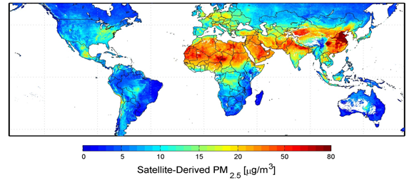 圖1 通過衛星獲取的全球PM2.5圖譜(μg/m3)
