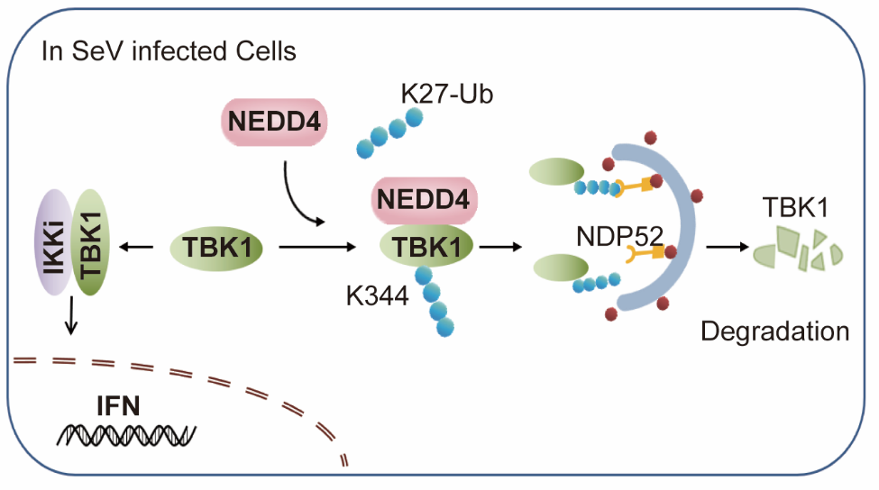 崔雋教授團隊發現,NEDD4能夠顯著抑制抗病毒免疫反應及促進病毒復制。NEDD4在病毒感染中結合TBK1,并顯著促進TBK1的降解,但是在無病毒侵染時,NEDD4不影響TBK1的穩定性。進一步研究發現這是由于NEDD4主要靶向磷酸化的TBK1(p-TBK1),并促使p-TBK1發生自噬降解。當TBK1的磷酸化位點(S172)突變后,NEDD4不再能夠與之結合并促進其發生自噬降解。NEDD4促使激活的TBK1在K344位點發生K27類型的泛素化修飾。選擇性自噬識別受體NDP52通過K27類型的泛素鏈識別TBK1并將其輸送至自噬溶酶體中進行降解。以往的研究表明在病毒侵染的早期,TBK1會發生K48類型的泛素修飾,進而通過泛素-蛋白酶體途徑降解。該研究進一步揭示在病毒侵染的后期,激活的TBK1主要發生K27類型的泛素修飾,使得TBK1通過選擇性自噬降解途徑進一步降解,防止TBK1被過度激活。因此,NEDD4介導的TBK1的自噬降解對于維持抗病毒免疫平衡具有重要的作用。