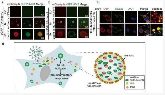 圖:新冠病毒核衣殼(N)蛋白通過(guò)形成LLPS招募TAK1及IKKβ促進(jìn)宿主NF-κB通路過(guò)度激活:a-b,純化新冠病毒N蛋白、TAK1及IKKβ,體外重構(gòu)相分離體系;c,細(xì)胞內(nèi)新冠病毒N蛋白促進(jìn)TAK1與IKKβ形成的“LLPS液滴”;d,新冠病毒N蛋白通過(guò)LLPS促進(jìn)NF-κB通路機(jī)制示意圖。