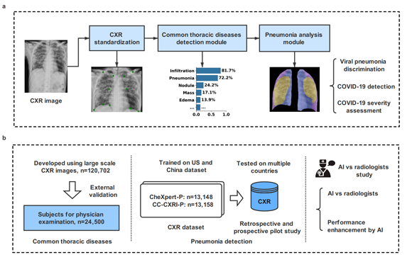 胸片及胸部CT是新冠肺炎篩查、診斷及病情評估的重要手段。胸片(CXR)十分簡單經濟而且普及,是篩查和診斷包括細菌性、病毒性在內的各類肺炎的首選手段,開發基于胸片的人工智能(AI)診斷系統能為新冠肺炎提供更加經濟且易于快速普及的診斷工具。