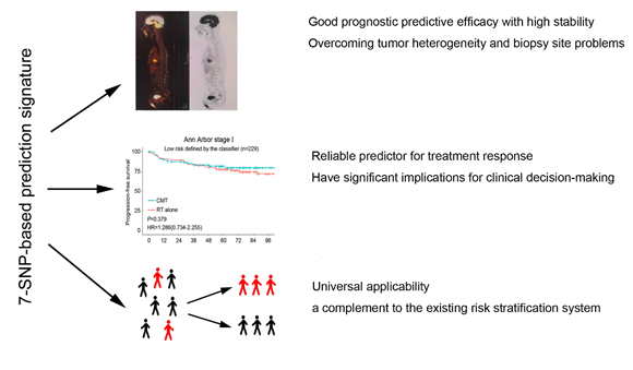 在這項國際回顧性多中心隊列研究中,首先使用高通量SNP芯片鑒定出與生存相關的36個SNP位點。進一步采用LASSO回歸模型構建了一個基于7個SNP的預測模型,可準確計算出個體化預后風險評分,該SNP預測模型在其他國內及國際隊列中也具有較高的預后預測效能,且其預測效能不受腫瘤樣本類型及腫瘤異質性影響,可作為當前IPI、KPI及PINK等預后系統的補充。在SNP預測模型基礎上進一步結合年齡、Ann Anbor分期等臨床指標構建的Nomogram評分系統可使預后預測效能進一步提高,對ENKTL患者個體化預后判斷具有重要意義。不僅如此,SNP預測模型還可用于指導臨床決策。在早期ENKTL患者中,SNP風險評分低?;颊呖山邮軉渭兎暖?,降低治療成本并減輕治療副反應;而SNP風險評分高?;颊邉t建議接受放化療綜合治療,降低復發風險。有助于規范個體化治療標準,為實現ENKTL精準治療提供有效新工具。