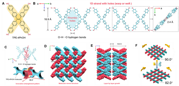 圖 (A) TPE-4PhOH分子式;2D-90單晶結構中:(B) 一維長鏈和分子間氫鍵,(C) 互鎖模式及其示意圖,(D) 沿c軸的二軸分子編織結構,(E) 沿a軸和b軸的層狀結構;(F) 2D-82和2D-90之間可逆性結構轉變示意圖。