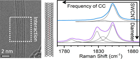 近期,利用單壁碳納米管轉化成的不同直徑的雙壁碳納米管為模板,合成了性能可控的一維碳鏈。如圖所示,通過左邊的電鏡圖可以直接觀察到一維碳鏈在雙壁碳納米管中時,碳納米管的直徑變窄,說明兩者之間存在較強的相互作用。通過碳納米管的直徑可以控制此相互作用的大小,從而最終實現了一維碳鏈的性能調控,其帶隙可在1.8到2.3電子伏特之間調節(如圖中右測的拉曼光譜所示,體現為峰位隨著碳納米管直徑的減小而產生紅移)。
