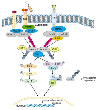 NF-κB和MAPK依賴的信號通路對機體炎癥反應具有重要作用。在信號轉導過程中,TAB2/ TAB3作為TAK1復合體的一部分,與TRAF6或RIP1結合的K63多泛素鏈結合,激活NF-κB和JNK/p38信號通路,以此來響應TNFR或TLR的激活。然而,免疫反應和炎癥反應在病原體感染條件下,尤其是炎癥性疾病中的精細調控仍知之甚少。郭德銀教授課題組利用CRISPR/Cas9第二代文庫在免疫細胞中進行了全基因組水平的大規模無偏差篩選,發現了一系列參與天然免疫反應調控的新型基因。篩選系統中顯示ASB1缺失后,病毒感染誘導的一型干擾素表達水平顯著性下降。通過進一步研究,作者發現ASB1可正向調節NF-κB信號通路。該蛋白因子被認為是ECS E3泛素連接酶復合體中的底物識別蛋白,介導底物的K48型泛素化和隨后的泛素-蛋白酶體途徑依賴地降解。作者發現ASB1在LPS和細胞因子TNFα和IL-1β的刺激下表達增加,正反饋調節LPS和細胞因子誘導的NF-κB信號通路活性,無論是在細胞系還是小鼠原代細胞BMDM和BMDC中都顯示了一致的現象。在生理水平上,ASB1缺失的小鼠對LPS和鼠傷寒沙門氏菌誘導的膿毒癥反應減弱,對細菌和病毒的清除能力降低,這些結果表明ASB1通過調控NF-κB信號通路調控了機體的炎癥反應。更有意思的是,ASB1缺失的小鼠對DSS誘導的炎癥性腸炎的炎癥反應減弱,體重減輕變慢,體內的炎癥因子表達水平下降,小鼠存活率提高。這一結果表明ASB1在無外源感染的狀態下也可以調控機體自身的炎癥反應。在機制上,ASB1的ANK功能域介導其與NF-κB信號通路中的關鍵節點蛋白TAB2/TAB3相互作用,抑制了它們K48型的泛素化,促進了TAB2/TAB3的蛋白穩定性,從而增強了TAB2/TAB3/TAK1介導的NF-κB和MAPK信號通路的激活,進而正向調控了炎癥反應。工作機制如下圖。
