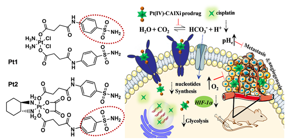 近日,我校毛宗萬教授團隊設計開發了碳酸酐酶IX(CAIX)抑制劑作為軸向配體的四價鉑(IV)前藥CAIXplatin,顯示了優越的抗腫瘤活性和臨床應用前景:(1)CAIXplatin通過對缺氧腫瘤細胞膜上的過度表達的CAIX的結合顯著促進腫瘤特異性靶向,對正常細胞株的毒性極低 (72h IC50>100 μM),且在缺氧條件下其腫瘤選擇性指數比順鉑和奧沙利鉑高70~90倍;(2) CAIXplatin具有很強的CAIX抑制活性,能夠提高癌細胞內氧氣水平、減弱胞外酸化程度,有效克服了腫瘤的缺氧和酸性微環境。蛋白組學分析發現,CAIXplatin同時顯著影響與腫瘤細胞能量供應和生物合成相關的代謝通路,導致乳酸的產生減少、能量供應(ATP)不足、生物大分子的合成原料嚴重短缺,從而有助于提高鉑類藥物對缺氧腫瘤的療效;(3)經過CAIXplatin處理可有效抑制缺氧腫瘤細胞的遷移和斑馬魚的血管生成、顯著降低腫瘤的血管內皮生長因子(VEGF)和血管生成標志物(CD31)的表達量,證明其具有良好的抗腫瘤轉移和抗血管生成活性;(4)在活體水平,CAIXplatin在腫瘤部位的累積量比順鉑和奧沙利鉑高4~7倍,其對MDA-MB-231腫瘤的抑制效果也遠遠大于順鉑和奧沙利鉑,同時有效減輕了鉑類藥物的骨髓造血系統毒性、肝毒性、腎毒性、耳毒性等,從而具有極大的臨床應用前景。