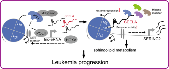 近日,我校生命科學學院陳月琴教授團隊揭示了lnc-eRNA SEELA在惡性白血病通過順式作用激活臨近基因的機制。研究發現,惡性白血病中特異性上調表達的lnc-eRNA SEELA被轉錄激活后,“落地生根”,直接結合組蛋白H4表面的K31位氨基酸。SEELA繼而在轉錄增強子座位發揮雙重支架作用,促進增強子組蛋白修飾-修飾識別蛋白的結合,激活增強子活性,最終通過順式作用激活臨近基因SERINC2的轉錄。功能研究發現,SEELA-SERINC2可以通過影響鞘脂代謝通路介導疾病發生發展(見圖1示意圖)。該研究首次發現了組蛋白H4可以通過直接結合RNA發揮功能,提示組蛋白H4和lnc-eRNA的結合可能是lnc-eRNA介導順式作用的基礎。該研究繼2019年9月在Blood期刊報道環狀RNA調控蛋白翻譯過程新功能基礎上,進一步揭示了新型非編碼RNA的作用機制。