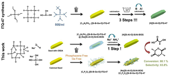 圖1 兩種制備具有強(qiáng)酸性中心的硅鋁BOG分子篩的路徑的比較:ITQ-47的合成后處理和晶種導(dǎo)向Si/Al功能化