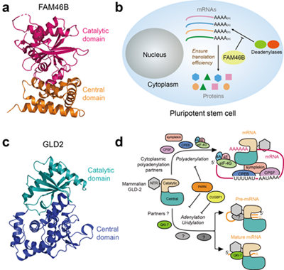 圖:a和b為人的FAM46B蛋白的結構和在多能干細胞中發揮功能的模式圖;c和d為大鼠的GLD-2的蛋白結構和在哺乳動物中通過不同的分子機制參與對各種RNA進行轉錄后3’末端加工過程的模式圖。