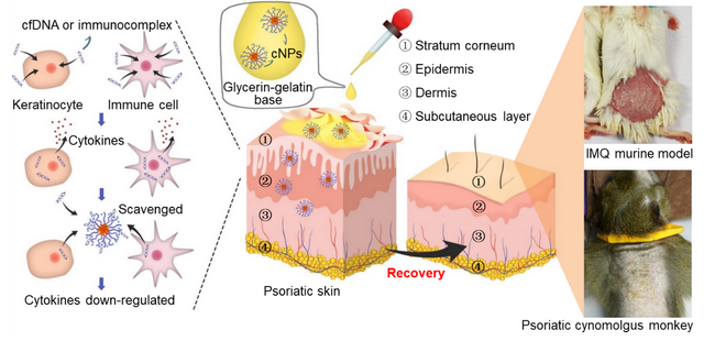 盡管銀屑病的發(fā)病機(jī)理很復(fù)雜,近年有報(bào)道指出游離核酸(cfDNA)在銀屑病進(jìn)程中發(fā)揮著關(guān)鍵的作用,臨床數(shù)據(jù)顯示在銀屑病重癥病人的血漿中cfDNA含量明顯上升,而進(jìn)一步的研究也表明在破損皮膚中大量存在的抗菌肽LL37可與銀屑病病人自身DNA形成免疫復(fù)合物打破免疫耐受,引起非正常免疫反應(yīng)。因此,陳永明教授和劉利新副教授團(tuán)隊(duì)創(chuàng)新性地將陽(yáng)離子聚合物納米顆粒(cNP)涂抹到銀屑病皮膚上進(jìn)行局部治療,利用cNP與cfDNA的高結(jié)合力來(lái)破壞DNA-LL37免疫復(fù)合物,抑制核酸復(fù)合物引起漿細(xì)胞樣樹突狀細(xì)胞和原代表皮細(xì)胞的激活,達(dá)到了減緩銀屑病模型中紅斑、鱗屑、硬化等癥狀。值得一提的是cNP在銀屑病樣食蟹猴中仍然發(fā)揮出有效的治療效果,且cNP在皮膚各層有較多的積累,卻沒(méi)有過(guò)多進(jìn)入系統(tǒng)循環(huán)去各個(gè)臟器,因此沒(méi)有產(chǎn)生明顯的系統(tǒng)毒性,具有很好的臨床轉(zhuǎn)化前景。